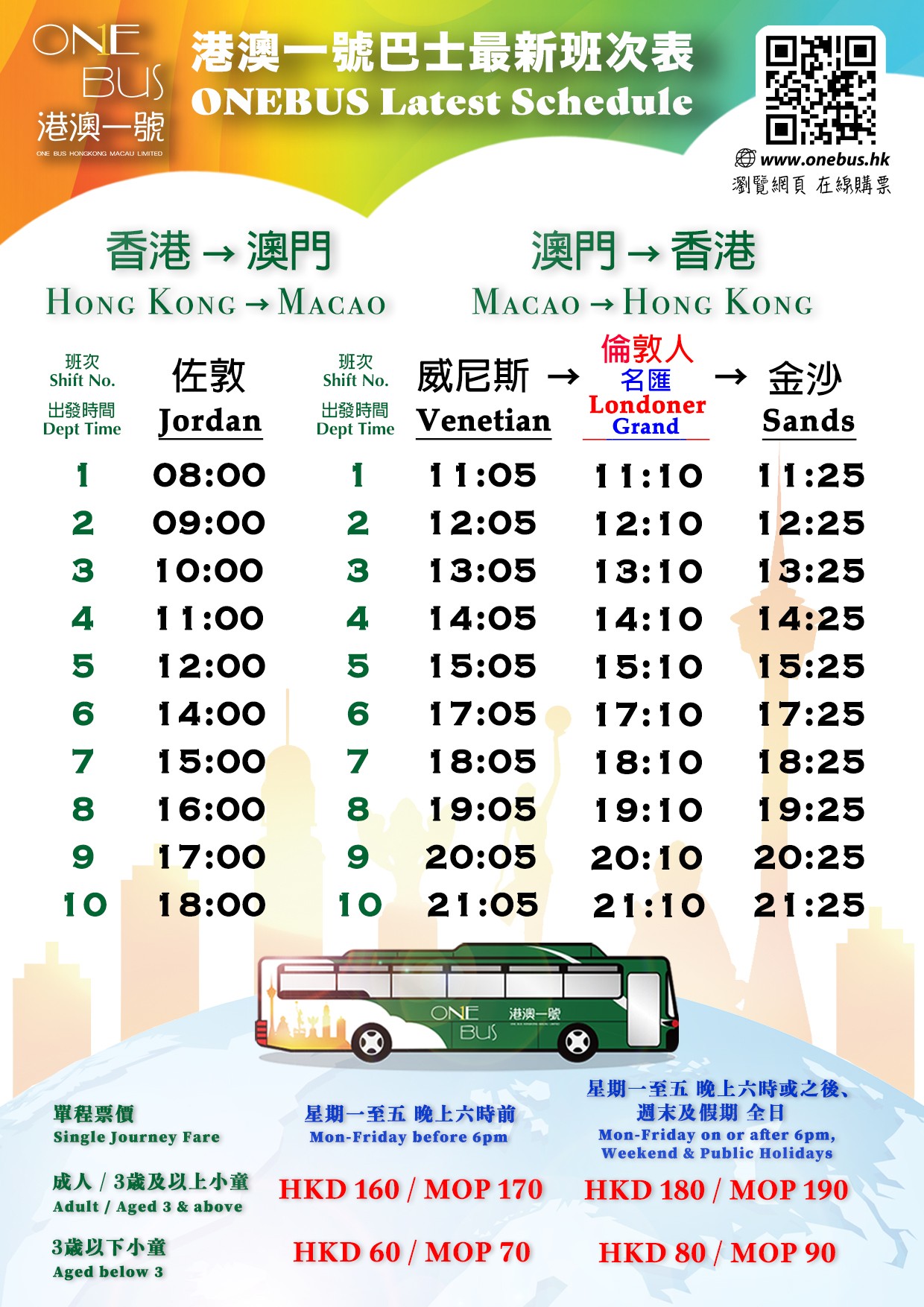 1. 如何預定車票?閣下可於One Bus網站、佐敦門市、澳門金沙集團的售票點購票,詳細地址可於以上購買車票一欄查閱。